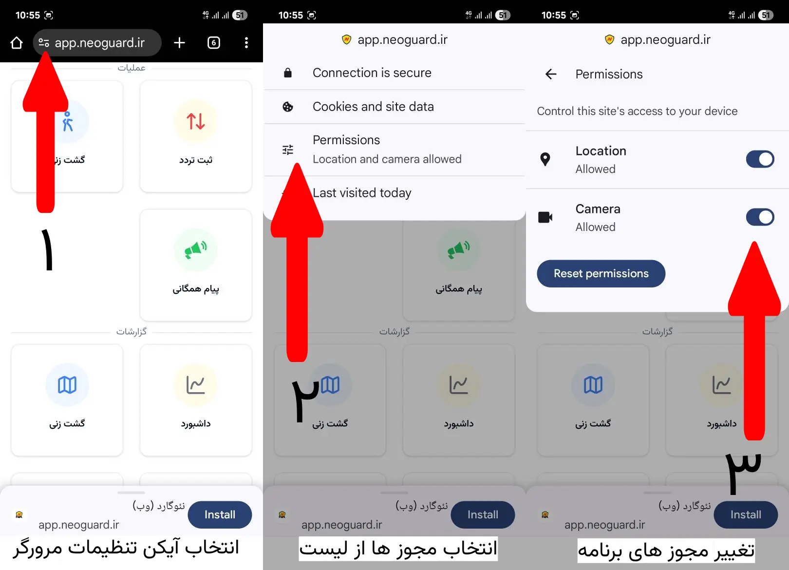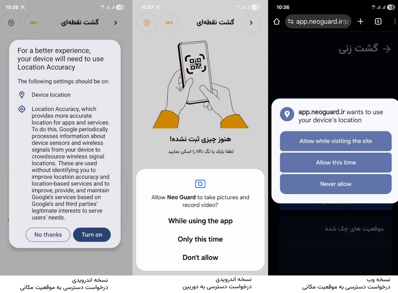 اپلیکیشن اندرویدی نئوگارد که برای انجام گشت و ثبت گزارش وقایع نگهبانان استفاده میشود، نیاز به دسترسی به GPS و دوربین دارد.