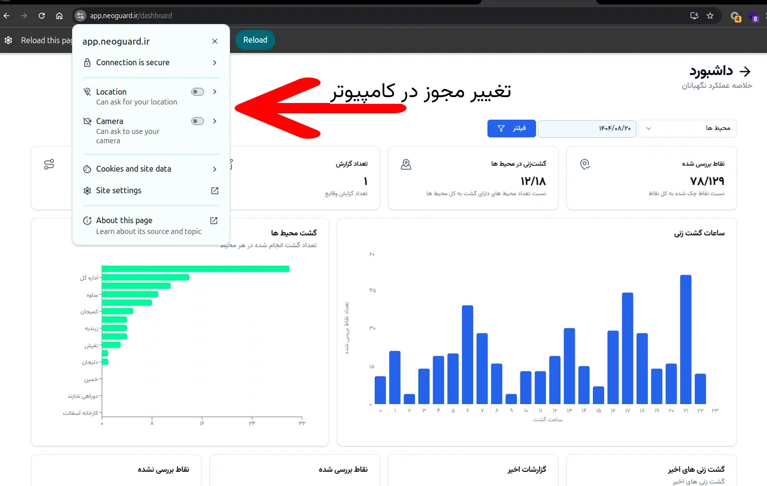 در صورت استفاده از مرورگر Chrome، میتوانید مطابق تصاویر زیر مجوزهای دوربین و مکان را مشاهده و فعال کنید: